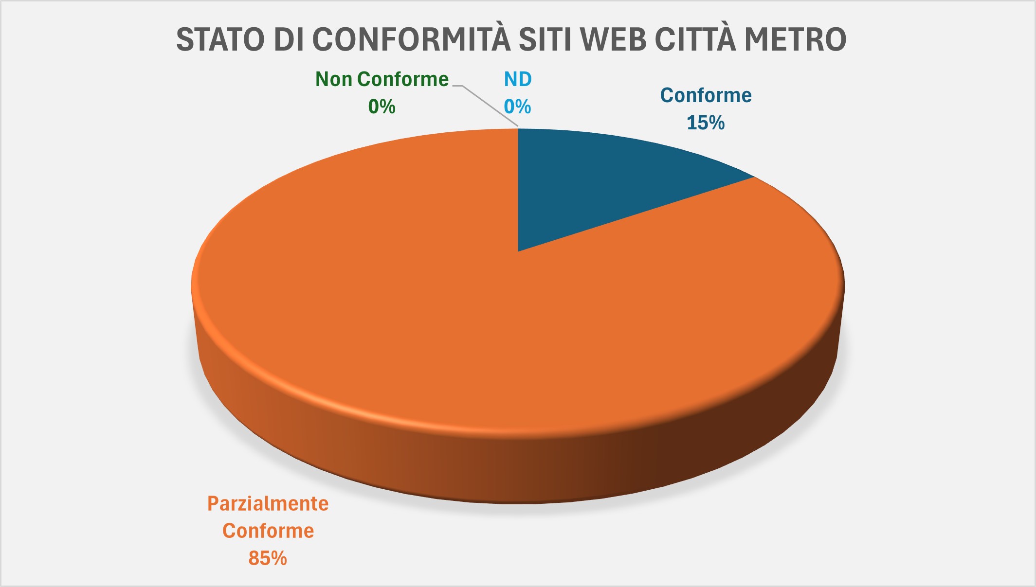 Per le Città Metropolitane (13) la situazione presenta dati più incoraggianti, con il 15% (2 Enti su 13) Conformi